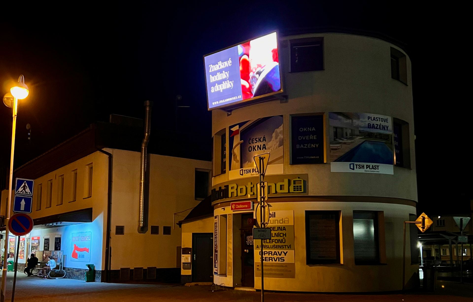 LED obrazovku najdete v Táboře na budově Rotundy, konkrétně na adrese Husovo náměstí č.p. 2983. Budova se nachází mezi autobusovým a vlakovým nádražím. Lokalita táborského nádraží je jednou z nejrušnějších ve městě a denně osloví tisíce lidí.